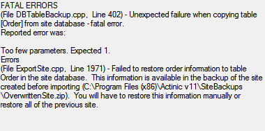 Unexpected failure when copying table [Order] from site database = fatal error. Reported error was: Too few parameters. Expected 1.