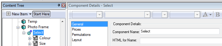 The Dynamic Choices feature is enabled by default for all products. The function comes into effect wherever a product has a Component with multiple Attributes. The Component is required, but can be hidden by blanking the ‘HTML for Name’ field in the General tab of the Component Details.