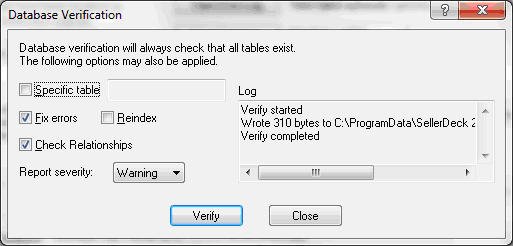 In SellerDeck 2014 onwards, some enhancements have been made to the verify database tool. The new tool can check and fix both primary keys and relationships within the database.