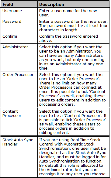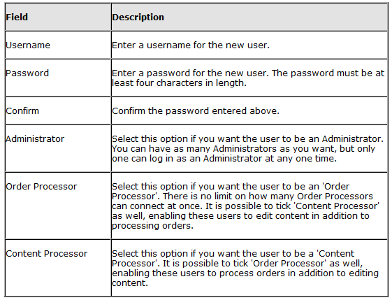 Go to 'Settings | Users' and select 'Add...' The fields in this new window are described below:
