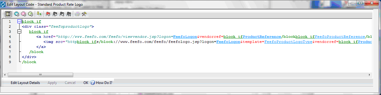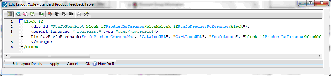 HTML Code:<actinic:block if="%3cactinic%3avariable%20name%3d%22FeefoProductReference%22%20%2f%3e%20%3d%3d%20%22%22" ><actinic:variable name="ProductReference" selectable="false" /></actinic:block><actinic:block if="%3cactinic%3avariable%20name%3d%22FeefoProductReference%22%20%2f%3e%20%21%3d%20%22%22" ><actinic:variable name="FeefoProductReference" selectable="false" /></actinic:block>
