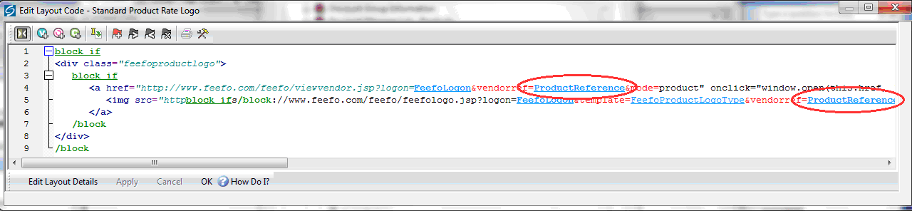 - On line 2 of the code, you will see two instances of the layout “ProductReference”