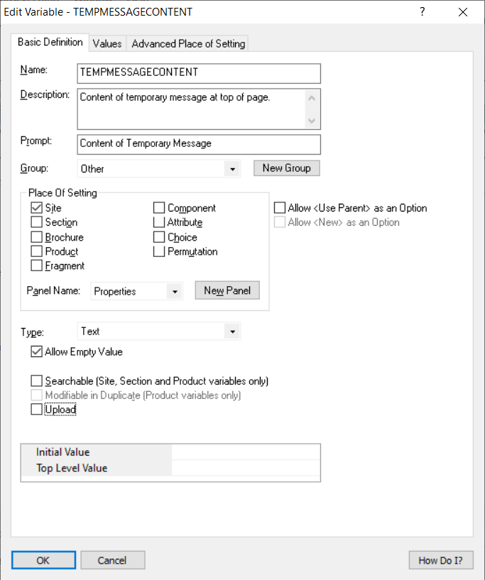 Then in the field 'Display Temporary Message' change the value to 'True' (when you no longer wish to display the message turn this to 'False').