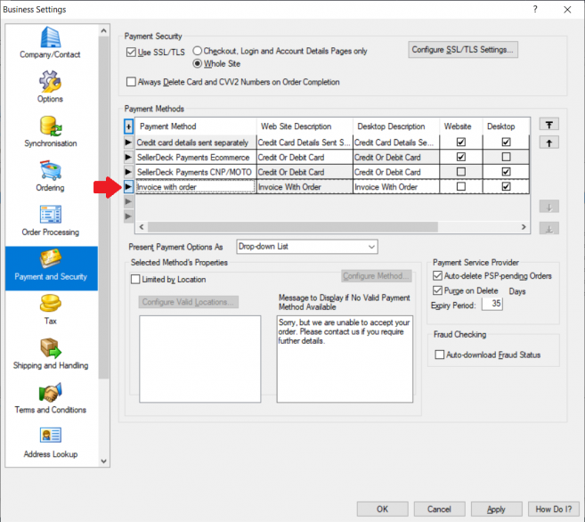 To do this, firstly go to 'Settings | Business Settings | Payment and Security' and go to the 'Payments' grid and click the + at the top of the grid to create a new line. Click into that new line, and select a non-PSP payment method such as 'Invoice With Order' and tick the box 'Desktop' only, so that it looks like the image below and click 'Apply' : -