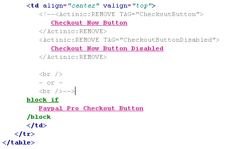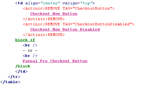 *comment out the code from '<Actinic:REMOVE TAG="CheckoutButton">' down to the 2nd '<br/>' tag so it looks like:
