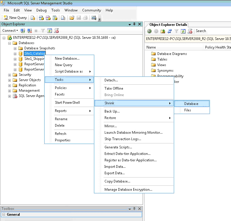- 3. Right click your database (ie Site1_Catalog) and choose: