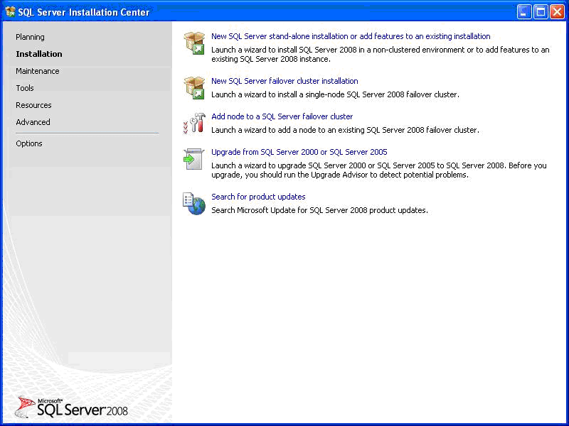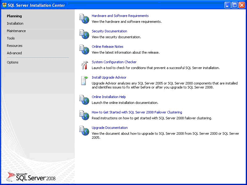 - The first screen you will see when running the SQL Server installer is the ‘SQL Server Installation Centre’. Here you choose how to plan an install, perform an install, maintain or repair an install etc
