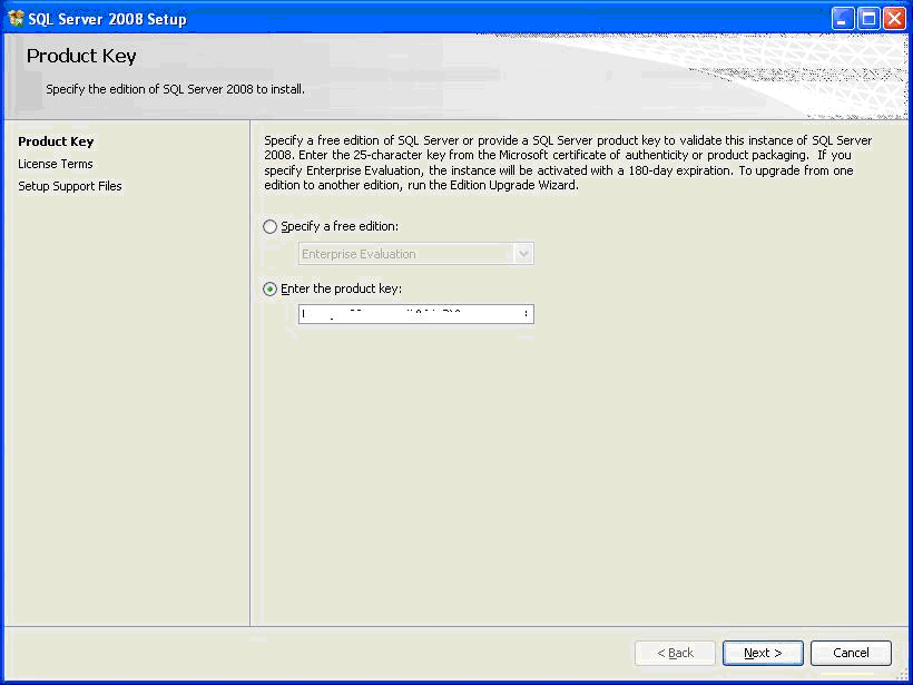 - The next screen prompts you for your product key. This will determine if you have ‘Standard’, ‘Developer’, ‘Enterprise’, ‘Workgroup’ etc