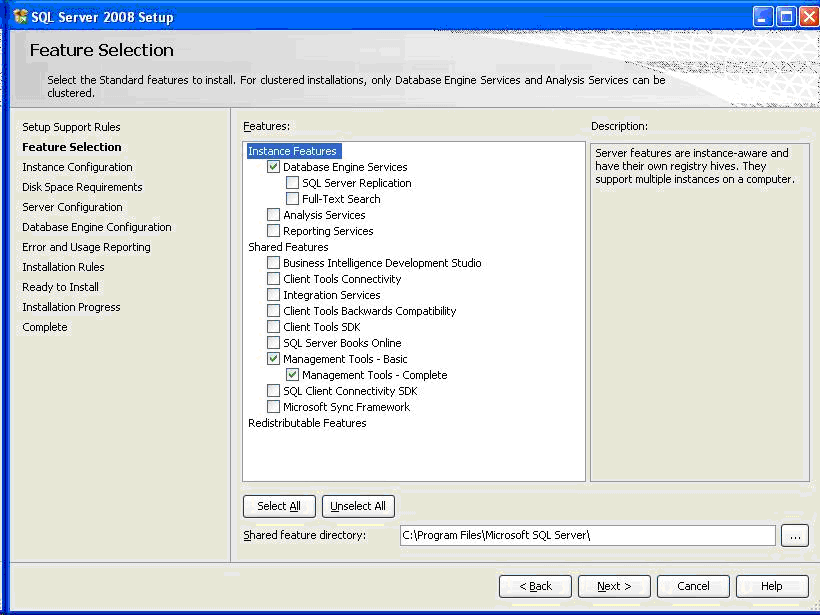 - The next screen is the ‘Feature Selection’. For SellerDeck, you only need ‘Database Engine Services’ and ‘Management Tools – Complete’.