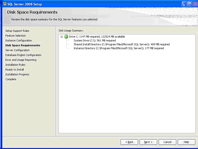 - The next screen tells you how much disk space is required to install this new Instance of SQL Server