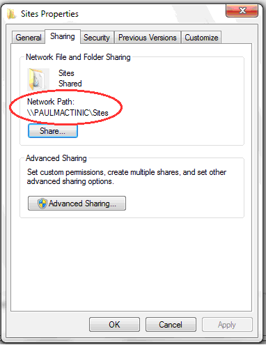 - Under the heading “Network Path:”, copy and paste this path into the field “UNC path to Shared sites directory”.