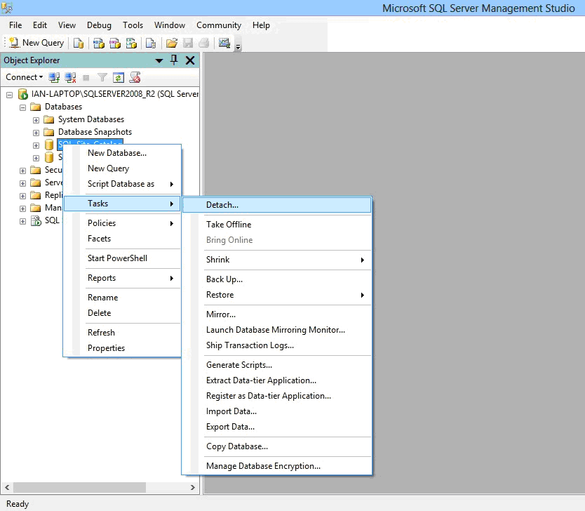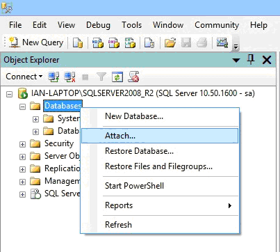 - In SQL Server Management Studio, right click on ‘Databases’ at the top of the tree and choose ‘Attach…’
