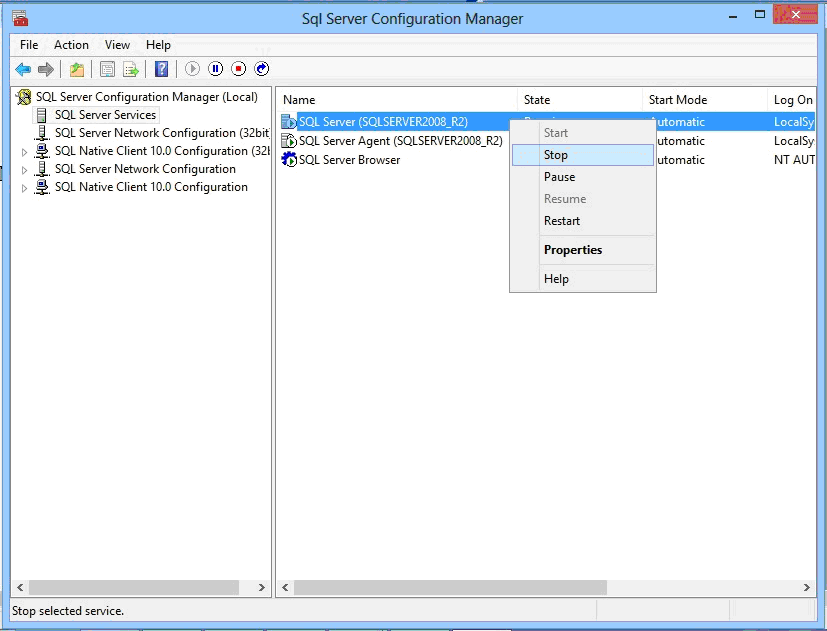 - Right click on the SQL Server service and stop it. The name of the SQL Server service will be the service name then the instance (install) name in brackets