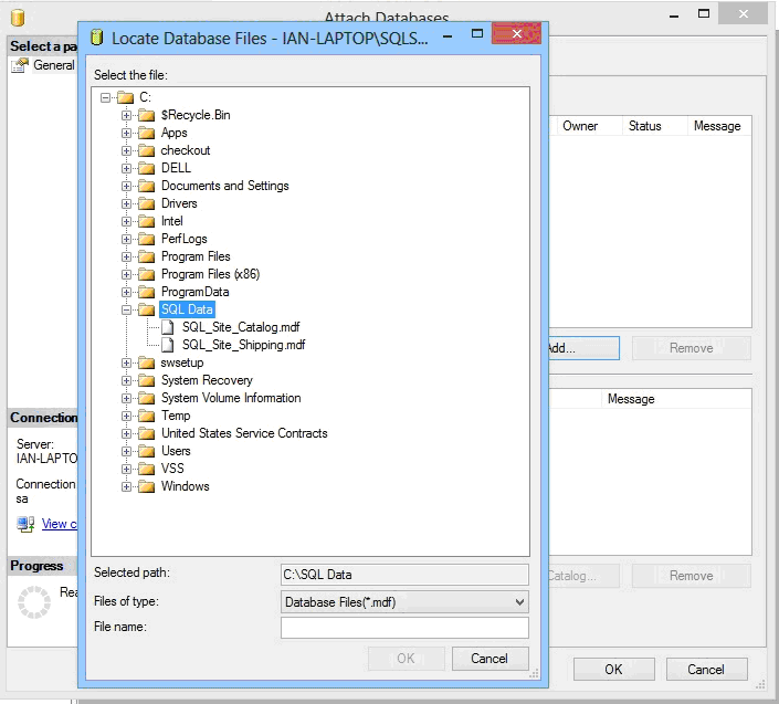 Select the Catalog.mdf file and press ok, and ok again. Do the same again for the Shipping.mdf file.