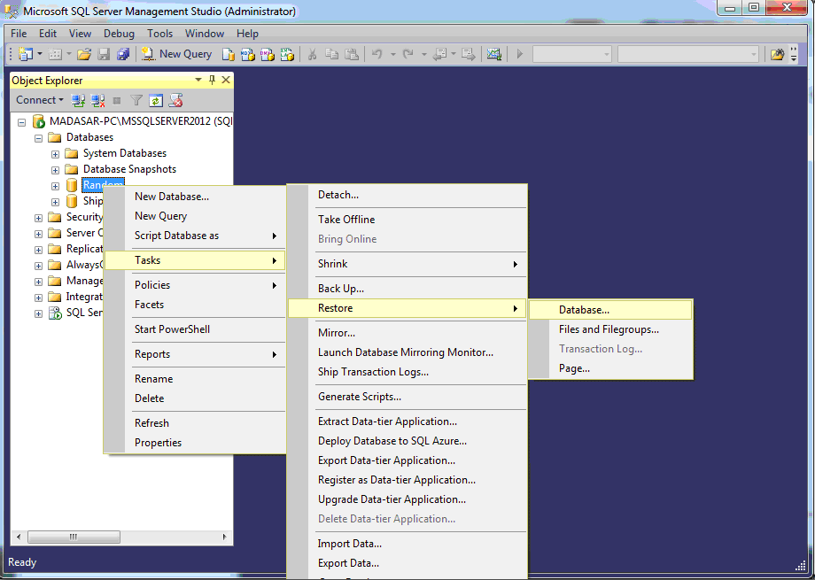 - Right click on the database and go to ‘Tasks | Restore | Database…’