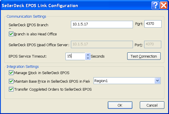 - ‘Integration Settings’ = Tick: ‘Manage Stock in SellerDeck Epos’ tick ‘Maintain Base Price in SellerDeck Epos in Field’ and select ‘Region 1’ from the drop down box. Tick ‘Transfer Completed Orders to SellerDeck Epos’