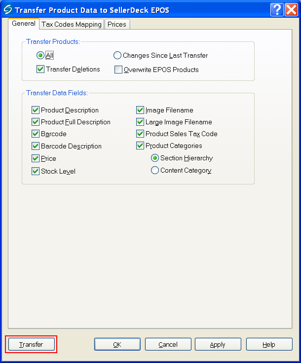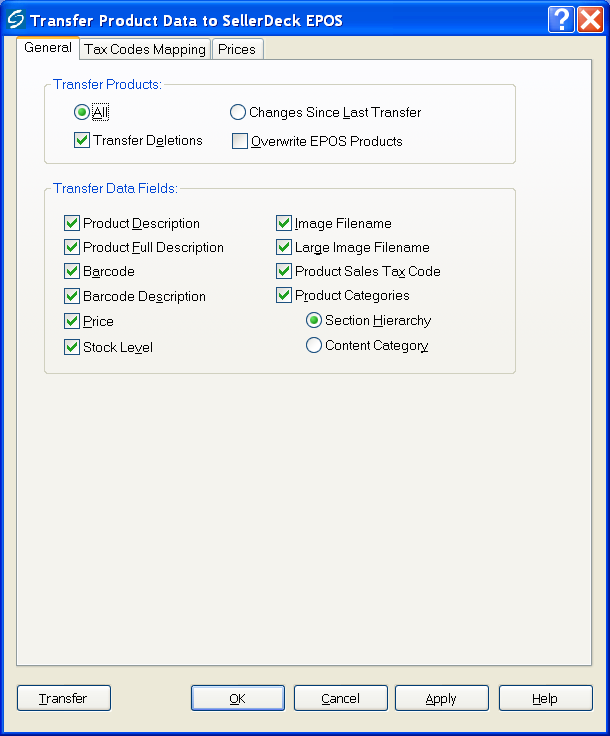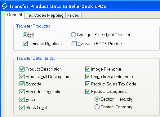 - Transfer Products All: This will transfer over all products within SellerDeck Ecommerce to Epos.