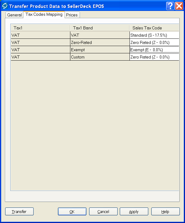 Under the ‘Tax Codes Mapping’ Tab (These tax codes will need transferring to epos – SellerDeck Epos Link\Transfer Tax Settings to Epos)