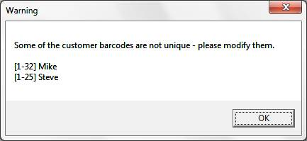 - When you open this screen, a warning will appear listing customer accounts, which have duplicate customer account codes. Make a note of them.