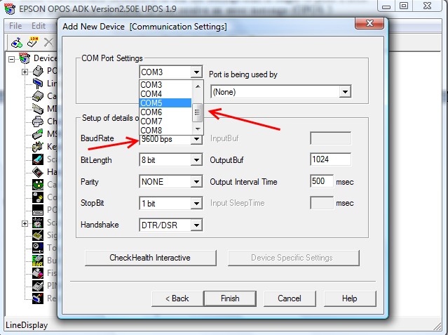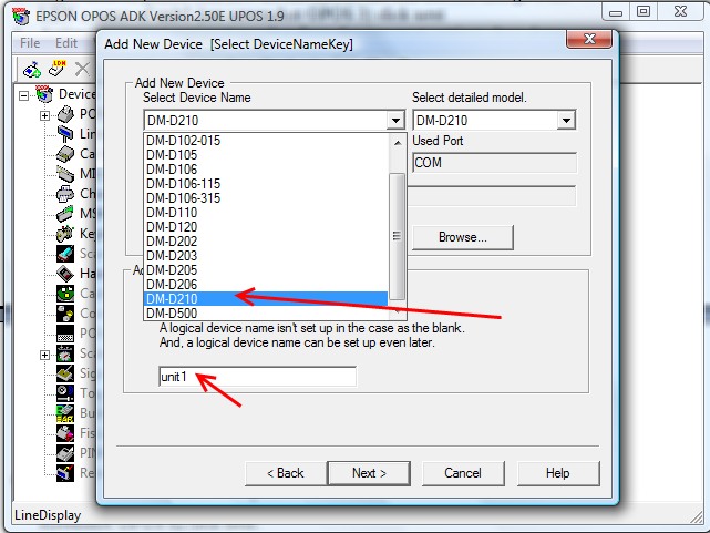 then check your com port settings and baud rate settings as noted in point 4 and alter until you have a successful healthcheck. - Now setup the Line Display. Right click on LineDisplay\add new device\choose the DM-D210 and give the LDN a name of unit1