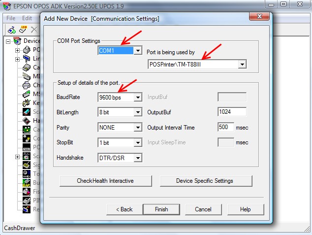 Check your Pole Displays baud rate by turning it off and on again, it will show you what it’s set to on the display screen when it boots up. If it’s set to anything than 9600, refer to the pole displays user guide on how to change the baud rate, this is usually done through altering the dip switches. When set select Finish. - Finally setup the Cash Drawer, this will be connected through the receipt printer. Plug the cash drawer RJ11 port into the back of the printer. In OPOS, Right click on Cash Drawer\add new device\choose Standard and give the LDN a name of unit1