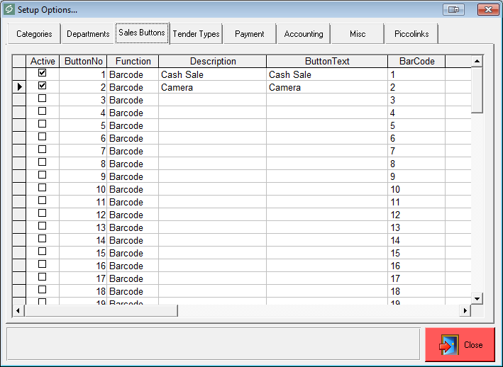 - Put a tick in the “Active” column then select the button no for your new button. Next fill out the “Description” , “button text” and “Back colour” fields. Then click “Close”