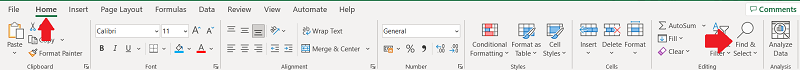On the 'Home' screen, click the 'Find & Select' button as shown in the image below: -