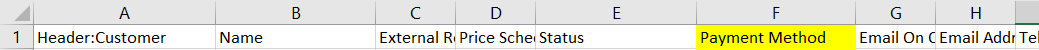 Open the file you have exported in your spreadsheet program (in this example Microsoft Excel is being used) and you will see at the top line a series of field titles. In the first column you will see 'Header:Customer', look along the line until you see 'Payment Method', see image below: -