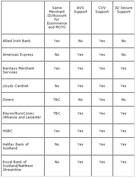 SellerDeck Payments integrates to all major UK banks, and some minor ones. The acquiring banks supported are listed below along with information concerning: