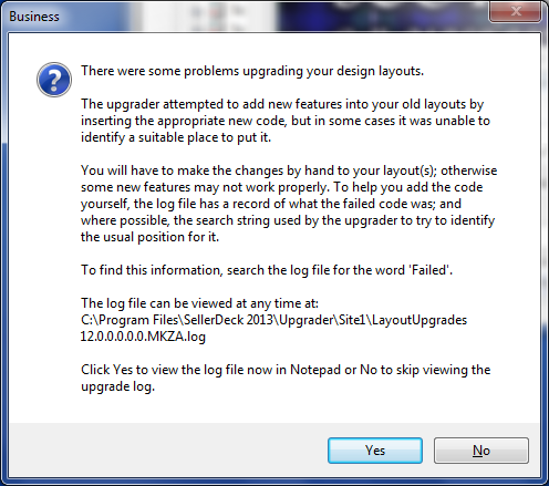 1. If you see this warning during upgrade, click “Yes”, this will open the Layout Upgrade log in “Notepad”.
