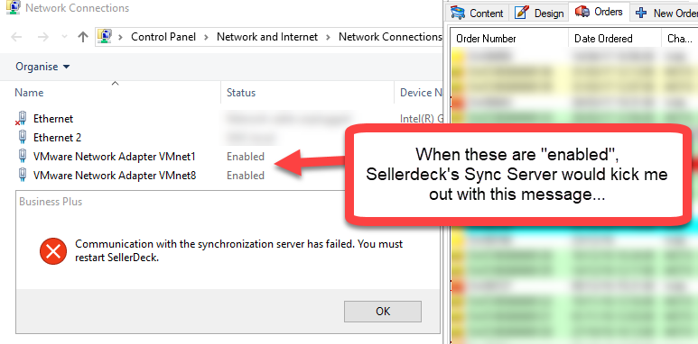 - then an old problem reared it's head = the update re-enabled some network adapters and Sellerdeck Sync Server would kick me out of the program - see image.