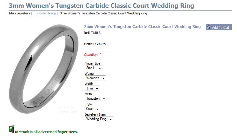 For instance to place "Men's Titanium Court 6mm Wedding Ring" into filtered results based upon its specification I would need to add the following choices to the product.