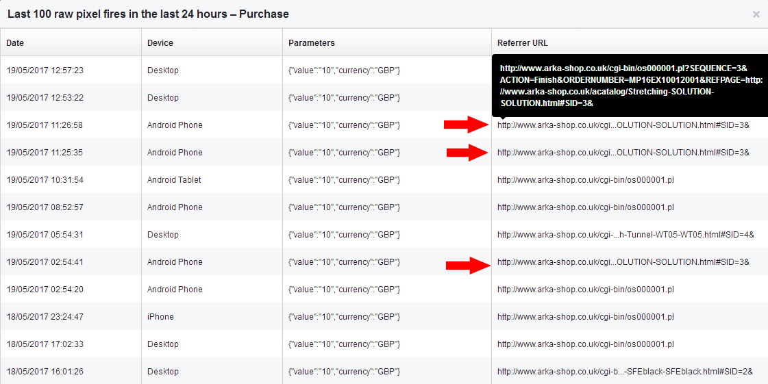 I went to look at the Pixel activity on the "Last 100 raw pixel fires in the last 24 hours – Purchase" and saw something odd.