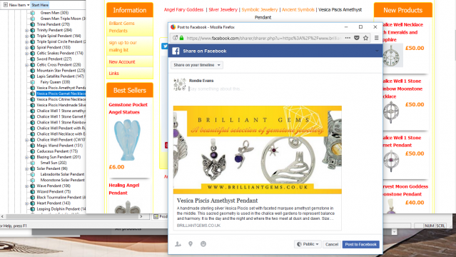 Hope someone can help shed light on this. When im on an individual product page and wish to use the share to face book link. A pop up page comes up with the preview of the share but its sharing the wrong image. Its not the product image but the header image that its trying to share. For example from here https://www.brilliantgems.co.uk/acat...s-Pendant.html