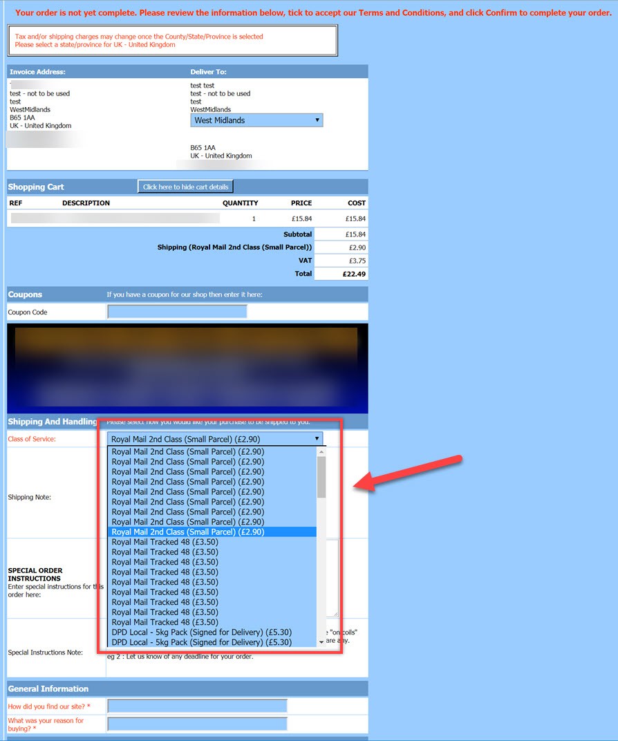 However, this page is static and the shipping options is directly beneath and does not change according to the selected County,