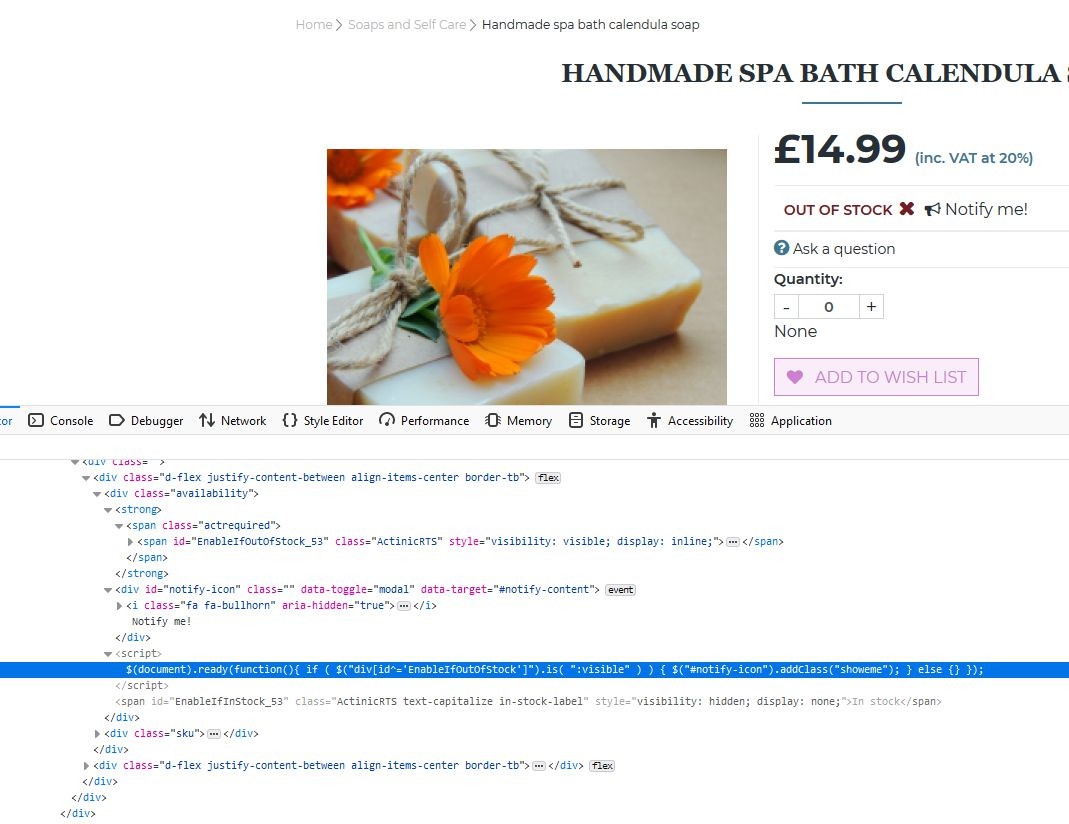 I am trying to add a clas to #notifyme to hide it if 'EnableIfOutOfStock_<actinic:variable name="ProductReference" selectable="false" />' is 'visibility: hidden' but although the script should work it does not work in Sellerdeck!