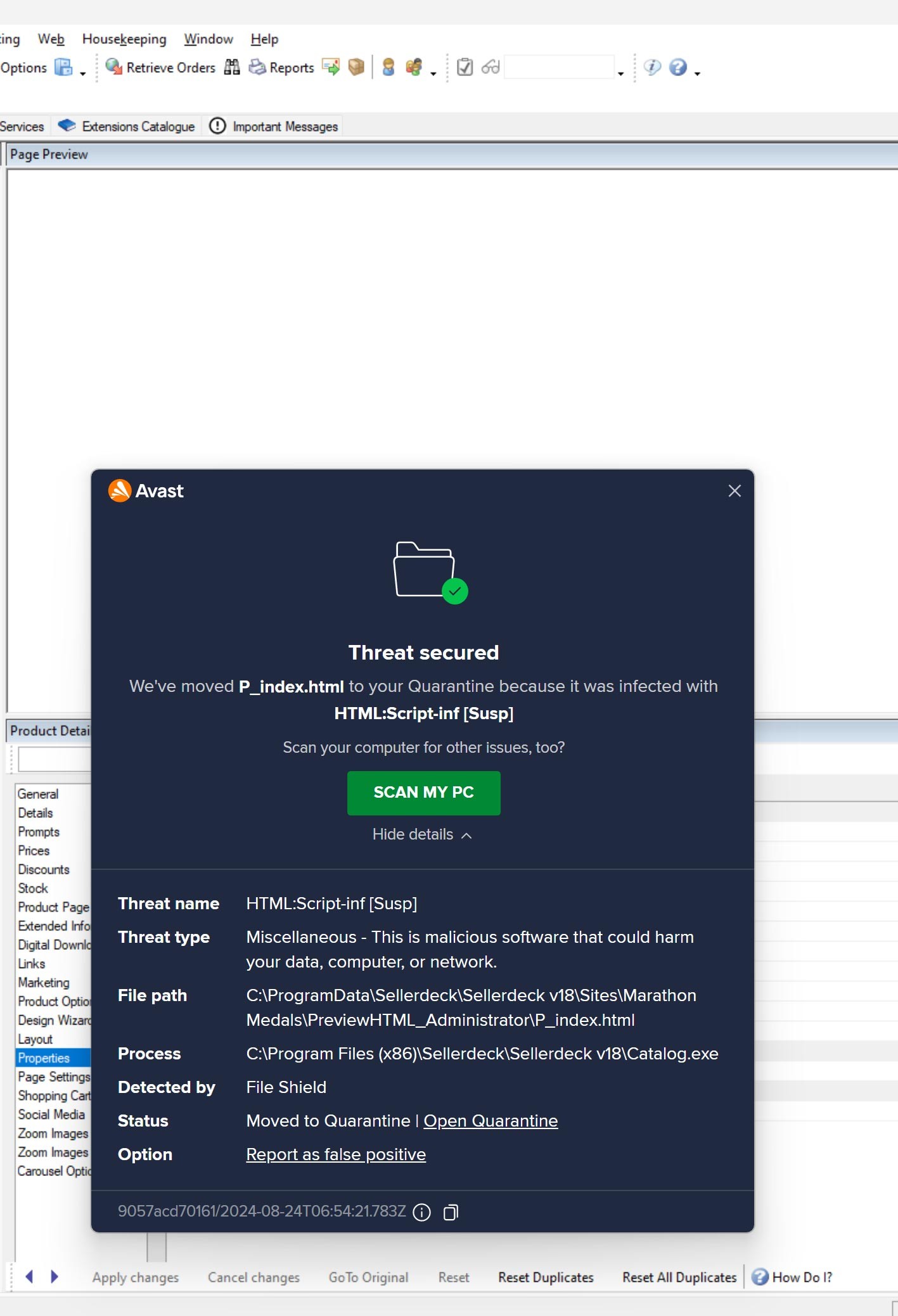 Hi, Yesterday, I had a website that stopped being viewed by my Avast antivirus software, and this morning, I can't even view the page preview in the Sellerdeck program as it says it is infected.
