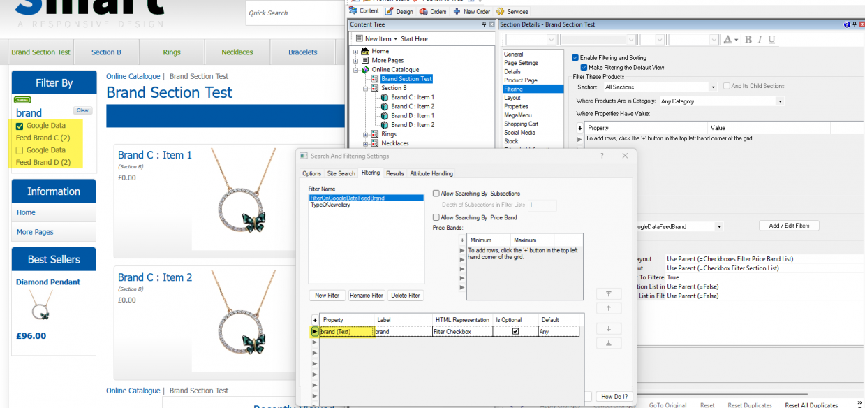 Tried my first attempt at Filtering, using the help file procedure, to automatically fill a section with products, therefore making it the default view. I only use the "brand" variable as an option.