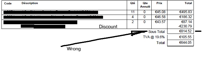 The issue is that the sub total then shows an incorrect amount. It shows the sum of the line items without reduction of the discount but with the addition of the tax on the discount amount. See example attached.