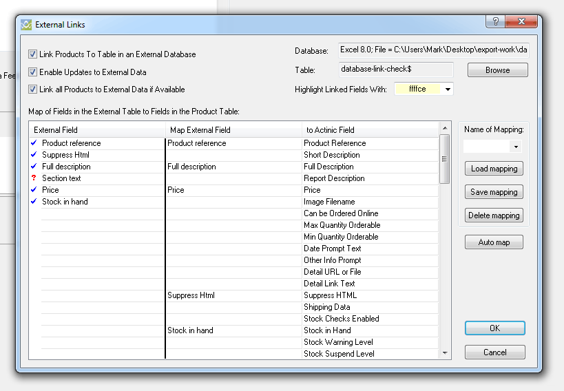 You can't combine external linking via a spreadsheet with the new real time stock control, it's one or the other