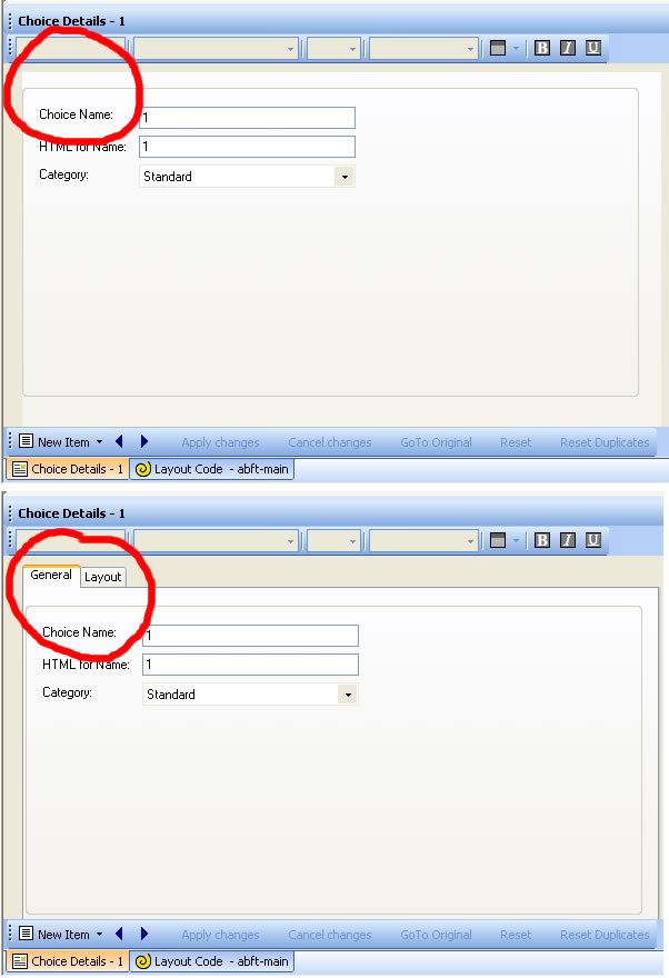 from now on, if I create a new choice, initially the layout tab is missing, but if I apply changes, and then return to the choice, the layout tab is back with us again.