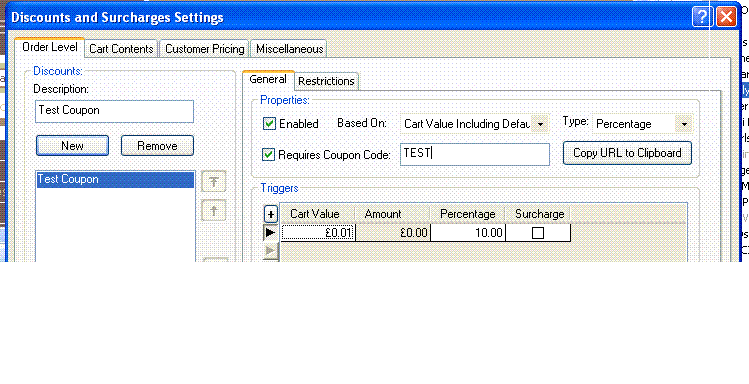 For the coupon - I've enabled it, added the code, under Triggers put in a cart value of £0.01 and 10.00 under Percentage. Under Misc have selected Allow Coupon Code Entry in checkout. I can go through the order process, enter code in checkout but the percentage isn't taken from the total...