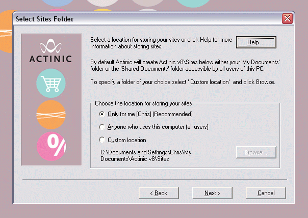 - When you get to the screen asking you where you want to create your sites, click 'Custom Location' and browse to 'C:\Program Files\Actinic v8\Sites'