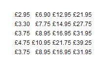 I have managed to create a table displaying the prices but so far without a column or row headers which is proving to be the tricky part.