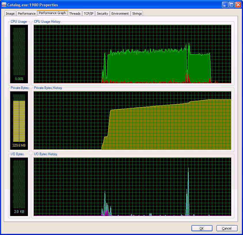 Out of interest attached is the activity of Catalog.exe on startup. It uses about 56% of one CPU whilst loading, then there's a low blip as the GUI opens it then uses exactly 50% for a short while after which the usage drops to almost zero.