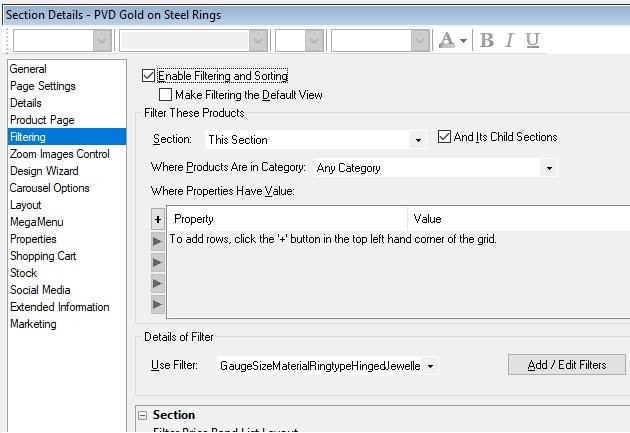 I'm not even sure if it's to do with the 'Make Filtering the Default View' tickbox - maybe it's something to do with the 'Where Properties Have Value' grid. The PVD gold page doesn't have any rows specified in the grid (this section has its own products and just displays those) whereas the Halloween page doesn't have its own products and so it only displays products from other sections.