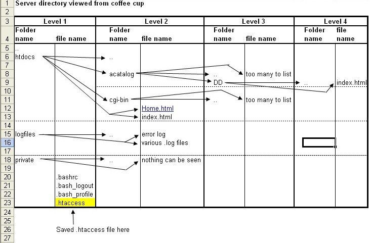 I have attached an excel spreadsheet to show where I put the .htaccess file. I think this is the root, but there is no folder designated as www as you can see in the attachment. However, the webpage does not redirect when I click on it, so I must need to change something.