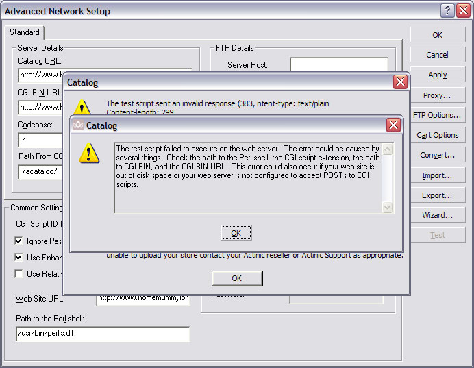The test script failed to execute on the web server. The error could be caused by several things. Check the path to the Perl shell, the CGI script extension, the path to CGI-BIN, and the CGI-BIN URL. This error could also occur if your web site is out of disk space or your web server is not configured to accept POSTs to CGI scripts.