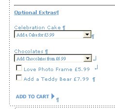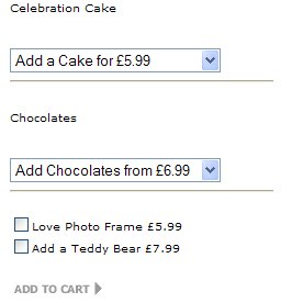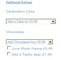 Celebration Cake <Actinic:PRICE_EXPLANATION PROD_REF="BB916" COMPONENTID=0> </Actinic:PRICE_EXPLANATION></p><INPUT TYPE="HIDDEN" NAME="v_BB916_0" VALUE="on"> <span class="actxsmall"></span><SELECT NAME="v_BB916_8" CLASS="actxxsmall"><br> <OPTION VALUE=-1 SELECTED>Add a Cake for £5.99 <br><OPTION VALUE=1 >I Love You<br><OPTION VALUE=2 > Happy Birthday<br><OPTION VALUE=3 >Happy Anniversary<br><OPTION VALUE=4 >Congratulations</SELECT><P CLASS="actxsmall"> Chocolates <Actinic:PRICE_EXPLANATION PROD_REF="BB916" COMPONENTID=1>