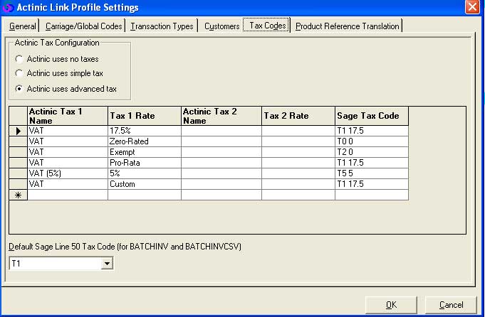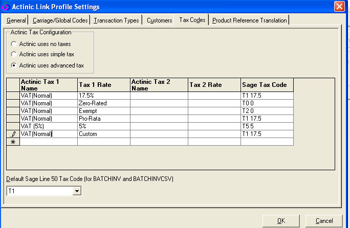 I am now trying to configure Sage/Actinic Link as we use this to transfer invoices into Sage, but when I use the drop down boxes to show the Actinic tax options, I cannot see 'Custom'. I have put the corresponding SAGE tax codes in in relation to Exempt, Vatable, Zero rated and Pro rata but just didn't know whether I need to tell Sage how to deal with the whole Custom tax thing and if so, how.